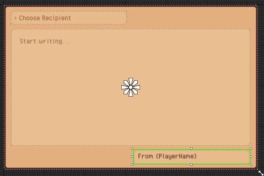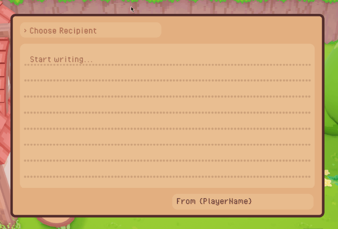 This is a GIF of the first thing I implemented - a letter composition widget kind of like Animal Crossing. It doesn't actually do anything except let you type, but it was enough to keep going off of to create the whole mailbox UI: