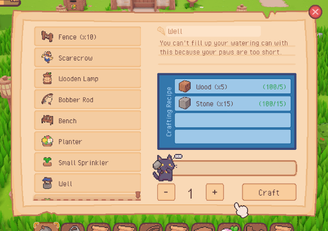Now, the debris and drops you find around your farm and out and about will serve a purpose. Some of these items are purely cosmetic, such as the planter. Some items help you on your farm, such as lamps lighting up the night, and sprinklers that help you water your crops. New tools, cosmetics, and building recipes are found when you discover new places, talk to new people, and obtain new items! New things in Snacko could inspire you to think of a new recipe, so try to explore and collect as many different materials as you can!