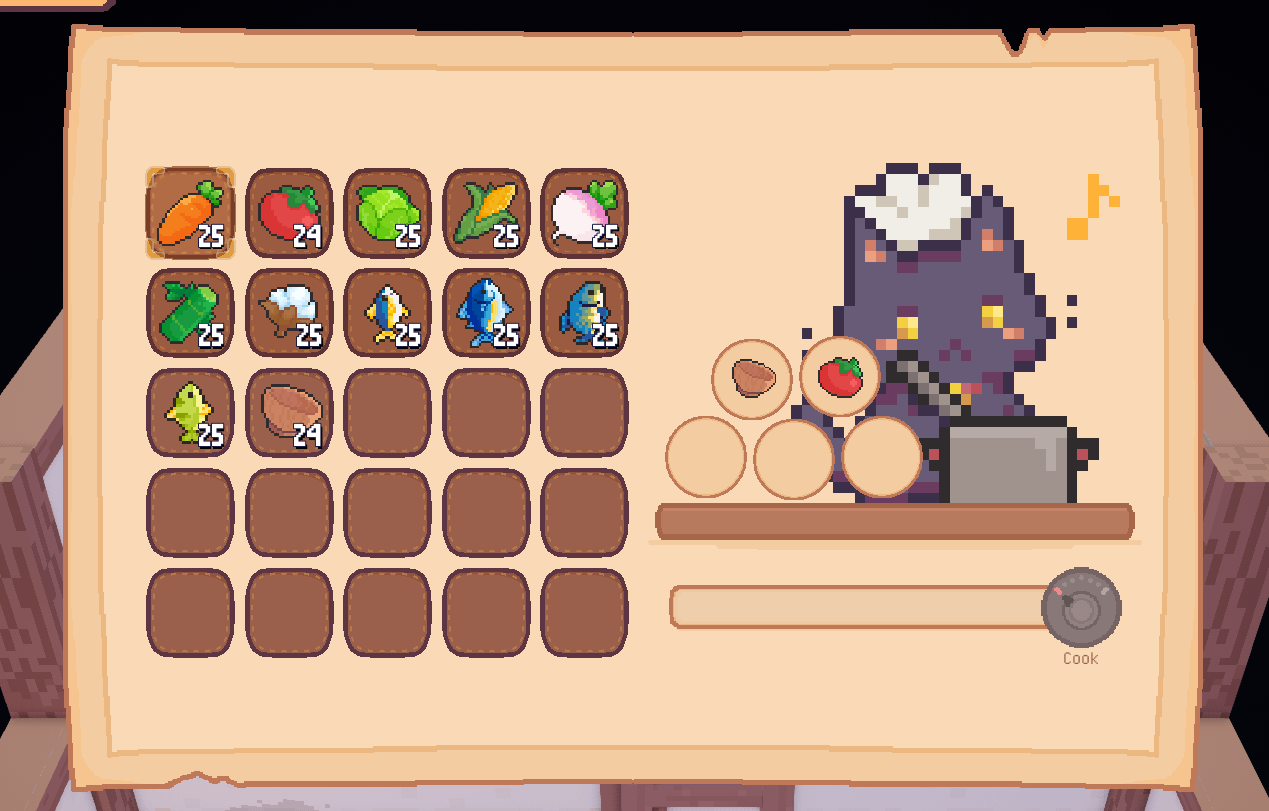 Cooking works a little differently in Snacko. In addition to the recipe book where you can access learned and tried recipes through your adventure like the crafting menu, you can also choose to experiment. There are three different kinds of recipes in the game - explicit, general, and a hybrid of the two. Explicit recipes would be dishes that need specific items, and they turn out the same every time - tomato soup, potato salad, and so on. There are also general recipes such as a garden salad or winter stew that will look for any item with the correct attribute. Each consumable item in Snacko has assigned attributes - is it a vegetable? A protein? Is it sweet, or sour, or both? General recipes can accept any ingredient and turn into the dish as long as those conditions are met. For example, a garden salad would look for any 3 ingredients with the "vegetable" attribute, while a fruit tart may look for both a "fruit" and "sweet" attribute to be successful.