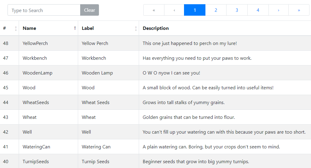 Recursive made a nifty web application that allows us to quickly add, remove, or modify item data and run it through a script to automatically update our data in the game engine. Before this, I'd have to painstakingly do it on the teeny-tiny UI of MySQL, and before that, I had to manually set the data for each new item I created, which took longer than making the sprite in some instances.