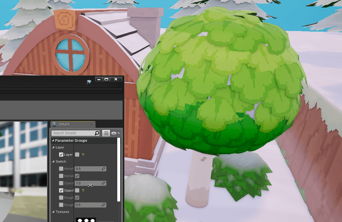 With this material, once a box is ticked, it generates a nice bit of snow on the tops of things. How much is covered in white and how distinct the shape is can be modified with two numbers that can be set individually for each item's material, but the default numbers work quite well for most things. If you look closely in the previous image, you can see little footprints behind Momo as well as fluttering snow!