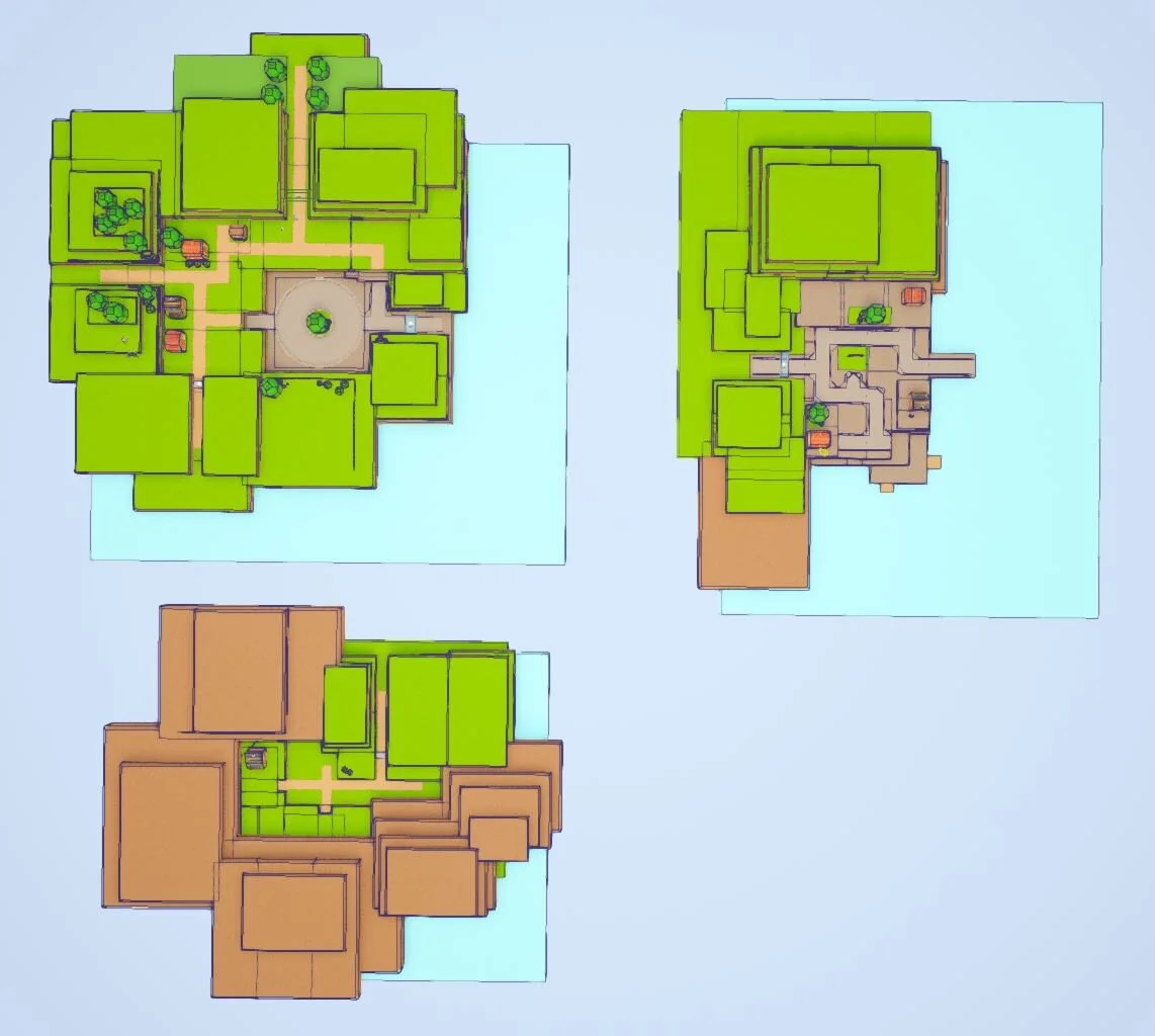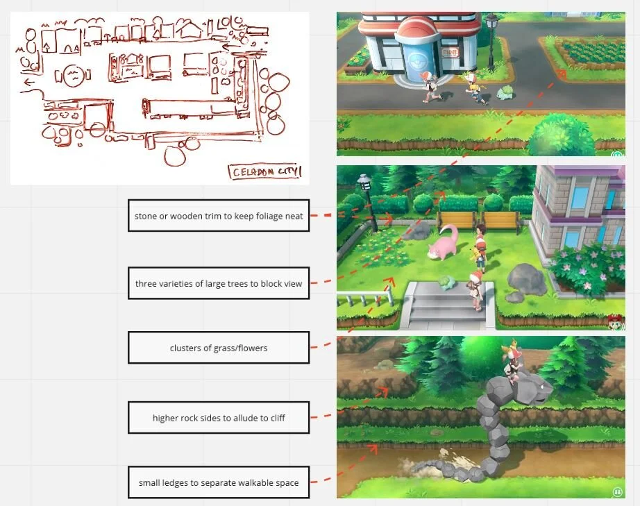 The whole of it is made from about 4 cubes with different trims on the sides and a world-aligned texture on the top. I took a lot of references from Pokemon Let’s Go on how they cut off player’s view in a 3D camera setting. Tiered landscapes, and lots of foliage is the way to go.