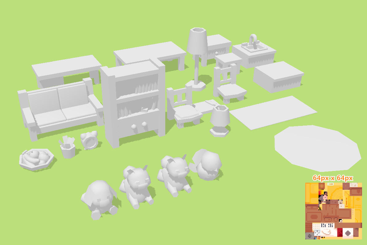The little stuffed toys and miscellaneous clutter like an open book and ink bottle topped off the set. I was able to use my super powerful pixel texturing skills (see: more polygons) and fit the entire set into one 64x64 pixel texture sheet. I’m pretty proud of that.