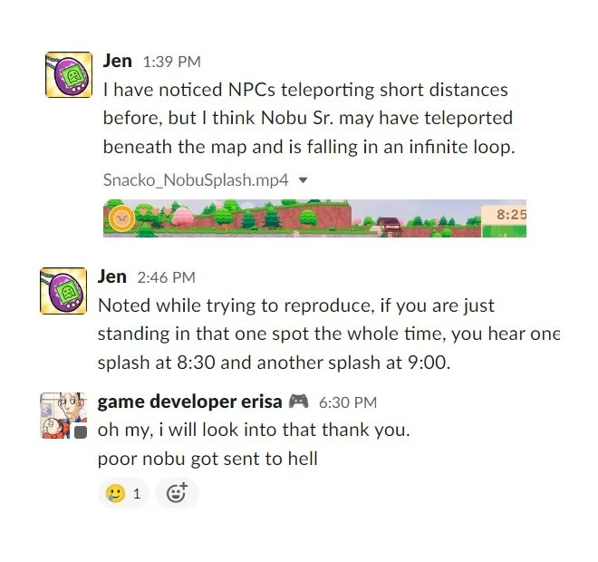 All in all, we probably squashed a little over 40 bugs of varying sizes and…intensity. Rest assured, Nobu is now safely in his house instead of falling until the end of time.