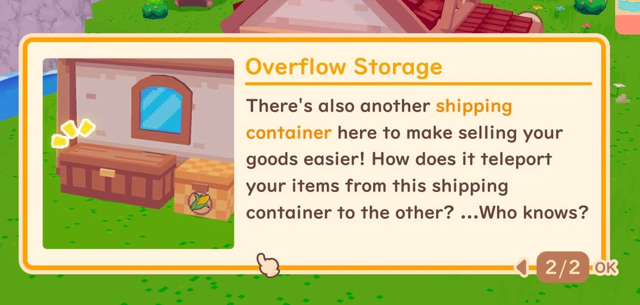 Now, the first time you interact with it, a tutorial popup tells you about it. I also added a shipping container beside your house, so you don’t have to walk all the way to the other side of the planet to sell your turnips.