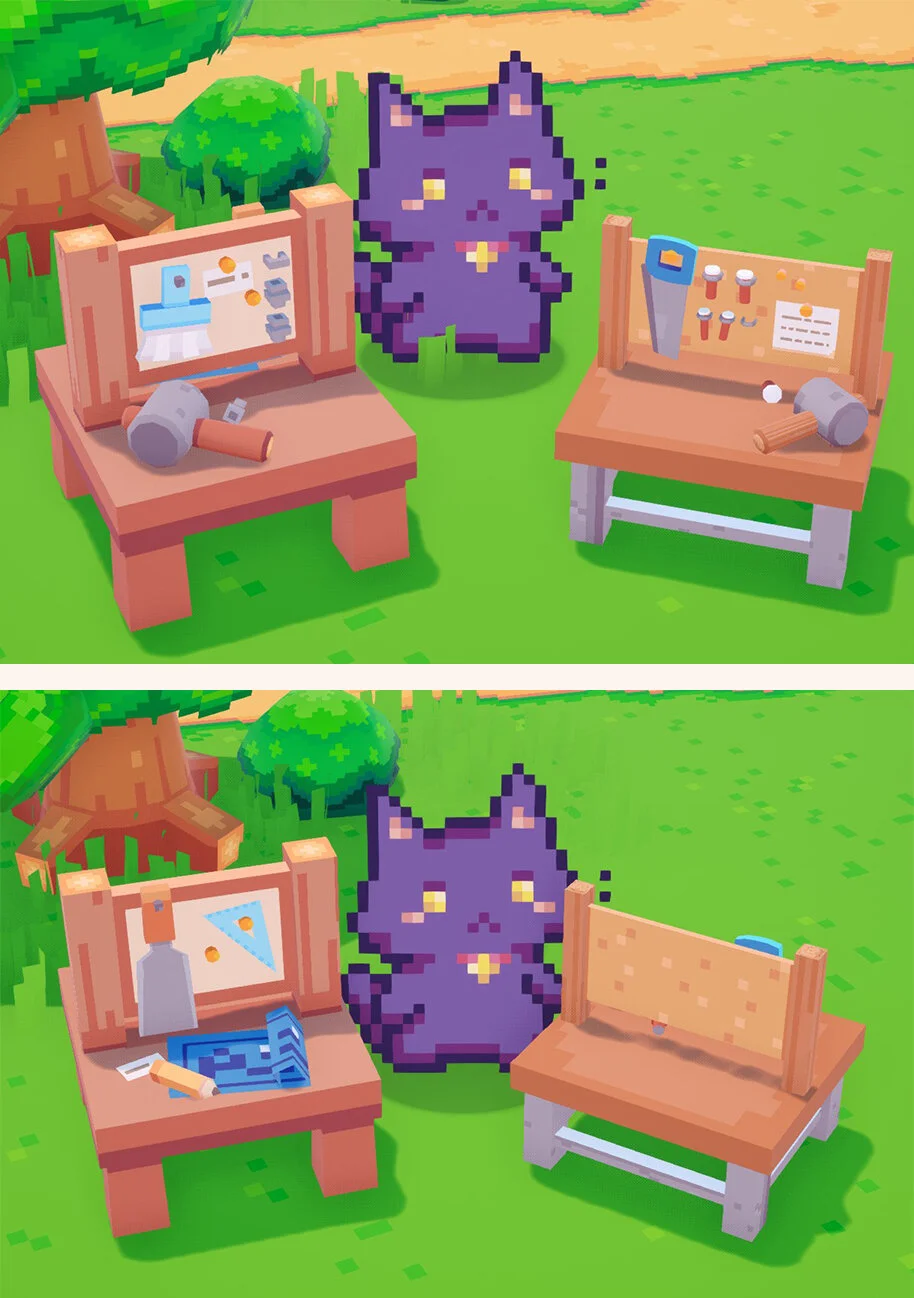 We had a couple of leftover objects here and there that needed that polish to match our current art style. Below, you can see the comparison of the front and back of the new (left) and old (right) Small Workbench.